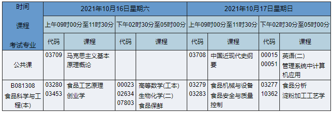 2021年10月湖南自考本科食品科學與工程專業(yè)考試時間為2021年10月16日-17日,2021年10月湖南自考本科食品科學與工程專業(yè)課程安排如下: