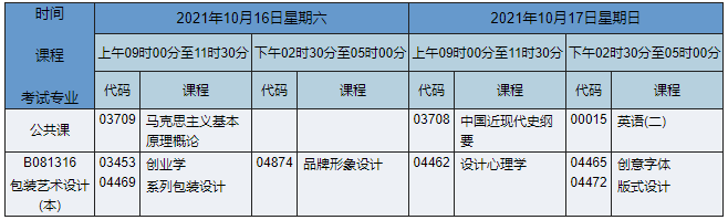 2021年10月湖南自考本科包裝藝術(shù)設(shè)計專業(yè)考試時間為2021年10月16日-17日,2021年10月湖南自考本科包裝藝術(shù)設(shè)計專業(yè)課程安排如下: