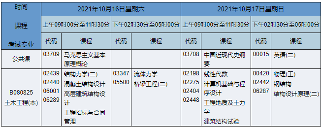 2021年10月湖南自考本科土木工程專業(yè)考試時(shí)間為2021年10月16日-17日,2021年10月湖南自考本科土木工程專業(yè)課程安排如下: