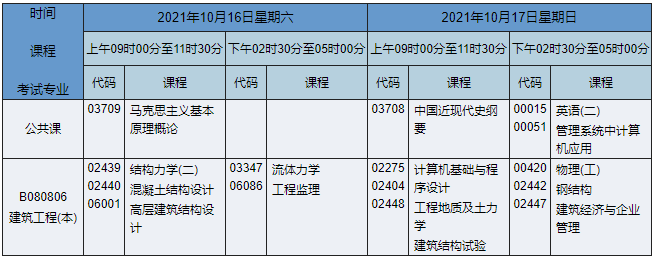 2021年10月湖南自考本科土木工程(原建筑工程)專業(yè)考試時間為2021年10月16日-17日,2021年10月湖南自考本科土木工程(原建筑工程)專業(yè)課程安排如下: