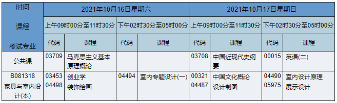 2021年10月湖南自考本科環(huán)境設計(原家具與室內設計)專業(yè)課程安排表