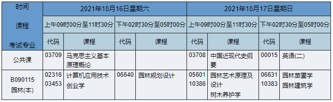 2021年10月湖南自考本科園林專業(yè)課程安排表