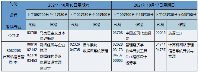 2021年10月湖南自考本科計(jì)算機(jī)科學(xué)與技術(shù)(原計(jì)算機(jī)信息管理)專業(yè)考試時(shí)間為2021年10月16日-17日,2021年10月湖南自考本科計(jì)算機(jī)科學(xué)與技術(shù)(原計(jì)算機(jī)信息管理)專業(yè)課程安排如下: