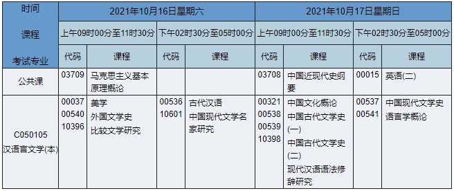 2021年10月湖南自考本科漢語言文學專業(yè)考試時間為2021年10月16日-17日,2021年10月湖南自考本科漢語言文學專業(yè)課程安排如下:
