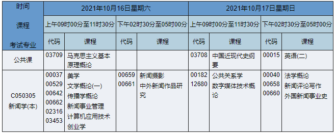 2021年10月湖南自考本科新聞學(xué)專業(yè)課程安排表