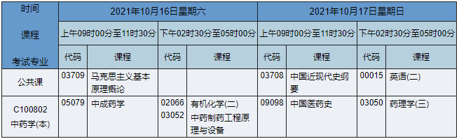 2021年10月湖南自考本科中藥學(xué)專業(yè)考試時(shí)間為2021年10月16日-17日,2021年10月湖南自考本科中藥學(xué)專業(yè)課程安排如下: