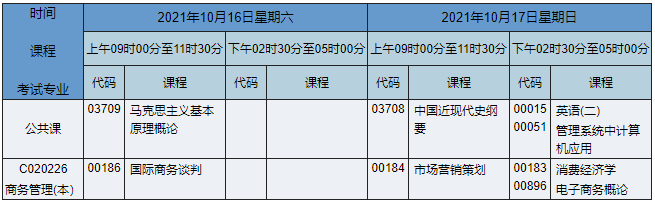 2021年10月湖南自考本科工商管理(原商務管理)專業(yè)考試時間為2021年10月16日-17日,2021年10月湖南自考本科工商管理(原商務管理)專業(yè)課程安排如下: