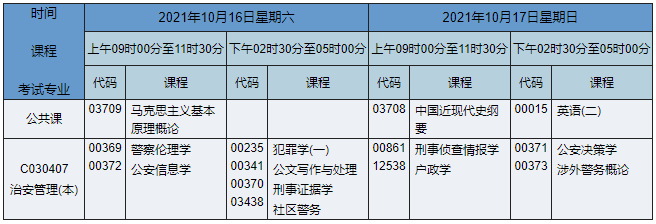 - 2021年10月湖南自考本科治安學(xué)(原治安管理)專(zhuān)業(yè)課程安排表