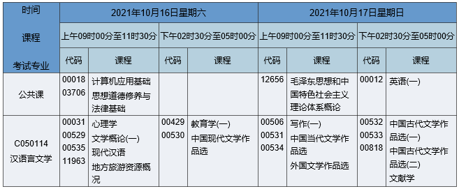 2021年10月湖南自考??茲h語言文學專業(yè)考試時間為2021年10月16日-17日,2021年10月湖南自考??茲h語言文學專業(yè)課程安排如下: