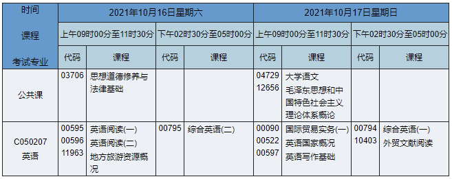 首頁(yè) > 考試安排> 湖南考試安排 > 2021年10月湖南自考專科英語(yǔ)專業(yè)課程安排表