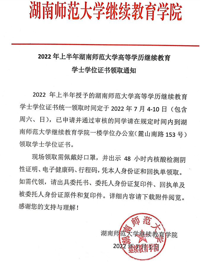 附件:2022年上半年湖南師范大學高等學歷繼續(xù)教育學士學位證書領取通知