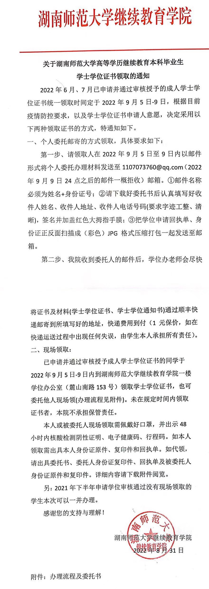 關于湖南師范大學高等學歷繼續(xù)教育本科畢業(yè)生學士學位證書領取的通知