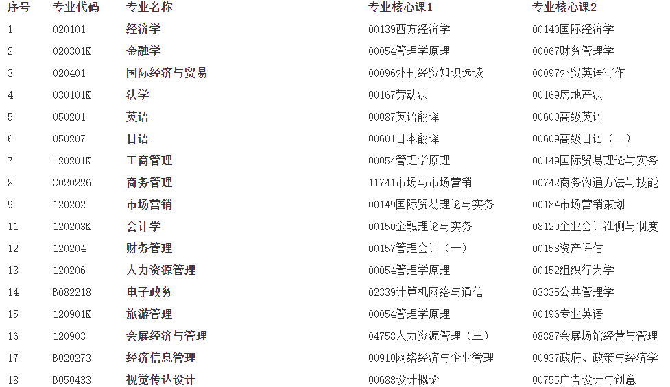 高等教育自學考試專業(yè)核心課程一覽表
