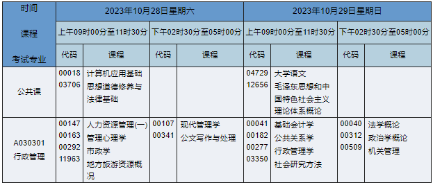 2023年10月湖南自考專科行政管理專業(yè)(專業(yè)代碼:A030301)課程安排如下: