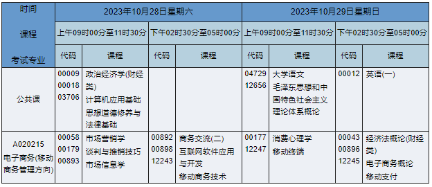2023年10月湖南自考??齐娮由虅?wù)(移動商務(wù)管理方向)專業(yè)(專業(yè)代碼:A020215)課程安排如下: