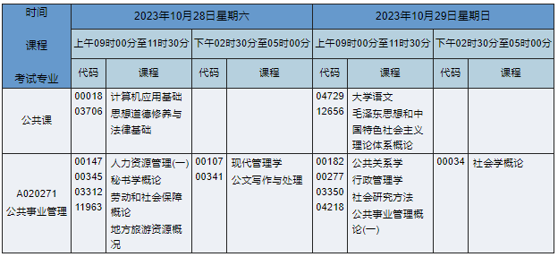 2023年10月湖南自考專科公共事業(yè)管理專業(yè)課程安排表