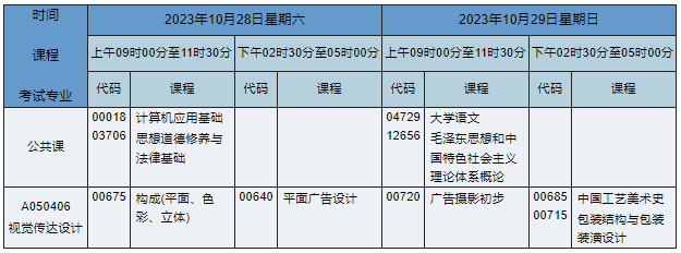 2023年10月湖南自考??埔曈X傳達設計專業(yè)(專業(yè)代碼:A050406)課程安排如下: