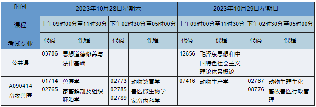 2023年10月湖南自考專科畜牧獸醫(yī)專業(yè)(專業(yè)代碼:A090414)課程安排如下: