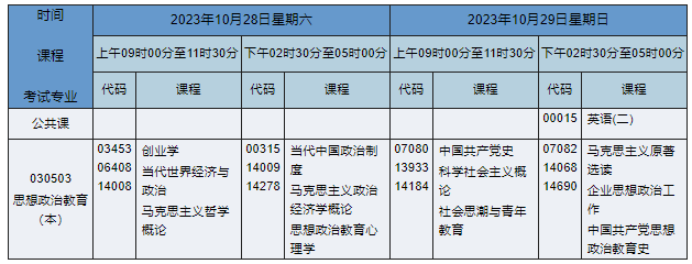 2023年10月湖南自考本科思想政治教育專業(yè)課程安排表