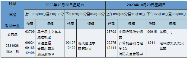 2023年10月湖南自考本科消防工程專業(yè)(專業(yè)代碼:083102K)課程安排如下: