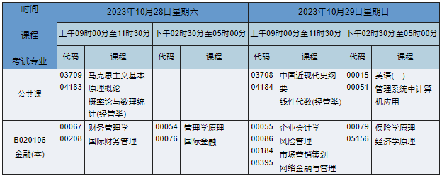 2023年10月湖南自考本科金融專業(yè)課程安排表