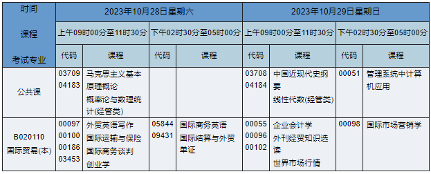 2023年10月湖南自考本科國際貿(mào)易專業(yè)課程安排表