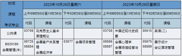 2023年10月湖南自考本科會展管理專業(yè)(專業(yè)代碼:B020180)課程安排如下: