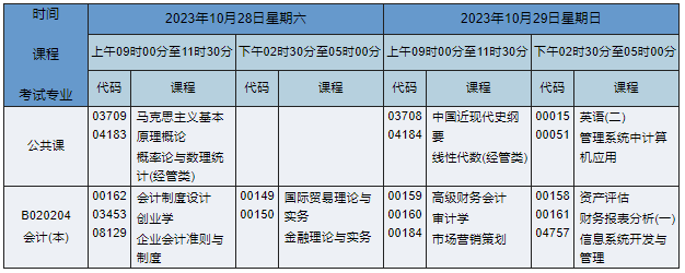 2023年10月湖南自考本科會計專業(yè)(專業(yè)代碼:B020204)課程安排如下: