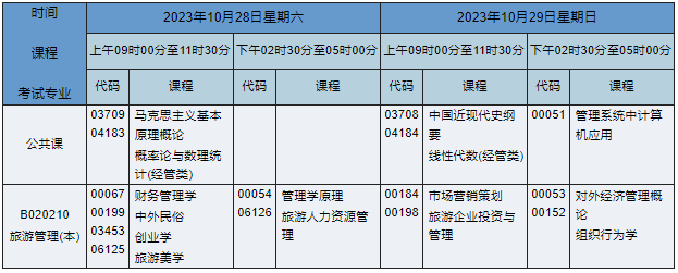 2023年10月湖南自考本科旅游管理專業(yè)(專業(yè)代碼:B020210)課程安排如下: