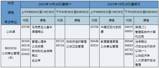 2023年10月湖南自考本科公共事業(yè)管理專業(yè)(專業(yè)代碼:B020230)課程安排如下: