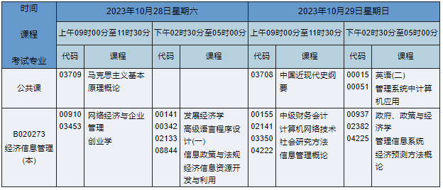 2023年10月湖南自考本科經(jīng)濟信息管理專業(yè)課程安排表