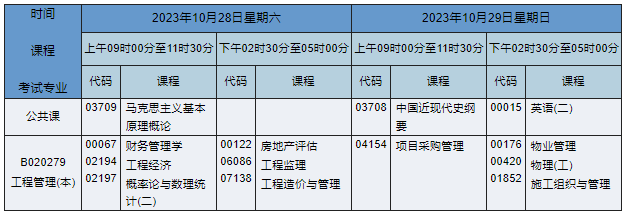 2023年10月湖南自考本科工程管理專(zhuān)業(yè)(專(zhuān)業(yè)代碼:B020279)課程安排如下: