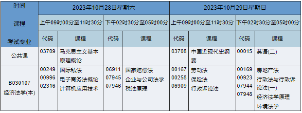 2023年10月湖南自考本科經(jīng)濟法學(xué)專業(yè)(專業(yè)代碼:B030107)課程安排如下: