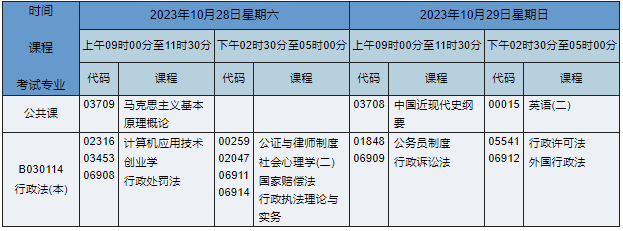 2023年10月湖南自考本科行政法專業(yè)(專業(yè)代碼:B030114)課程安排如下: