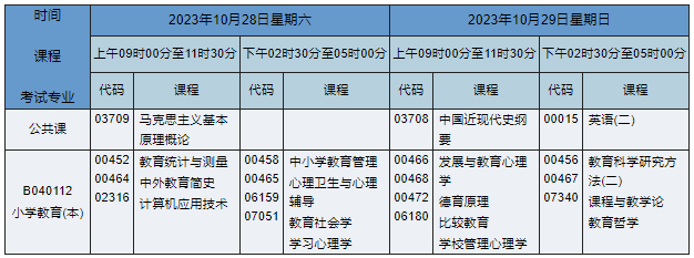 2023年10月湖南自考本科小學(xué)教育專業(yè)課程安排表