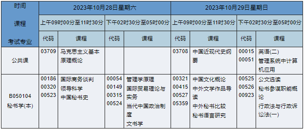 2023年10月湖南自考本科秘書學(xué)專業(yè)課程安排表