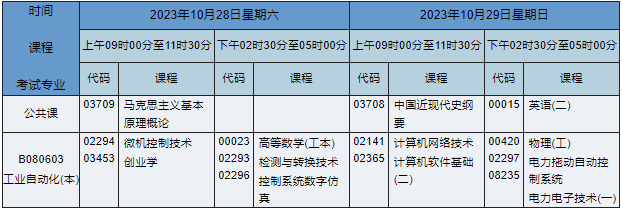 2023年10月湖南自考本科工業(yè)自動化專業(yè)(專業(yè)代碼:B080603)課程安排如下: