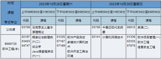 2023年10月湖南自考本科軟件工程專業(yè)(專業(yè)代碼:B080720)課程安排如下: