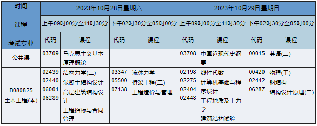 2023年10月湖南自考本科土木工程專業(yè)(專業(yè)代碼:B080825)課程安排如下: