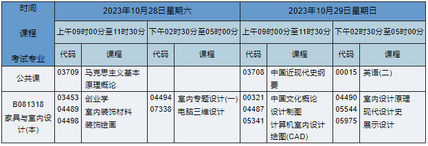 2023年10月湖南自考本科家具與室內(nèi)設(shè)計(jì)專業(yè)(專業(yè)代碼:B081318)課程安排如下: