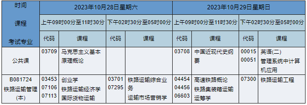 2023年10月湖南自考本科鐵路運輸管理專業(yè)(專業(yè)代碼:B081724)課程安排如下:
