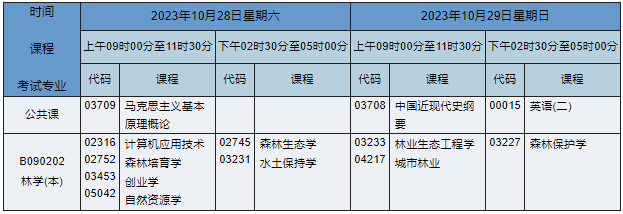 2023年10月湖南自考本科林學專業(yè)(專業(yè)代碼:B090202)課程安排如下: