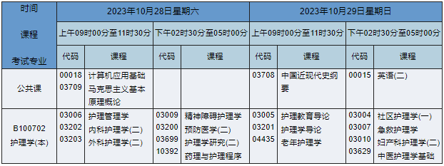 2023年10月湖南自考本科護理學專業(yè)課程安排表