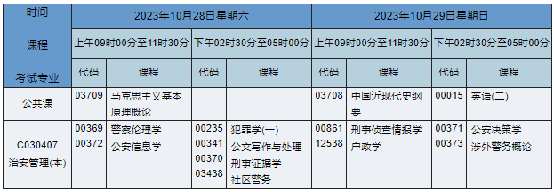 2023年10月湖南自考本科治安管理專業(yè)(專業(yè)代碼:C030407)課程安排如下: