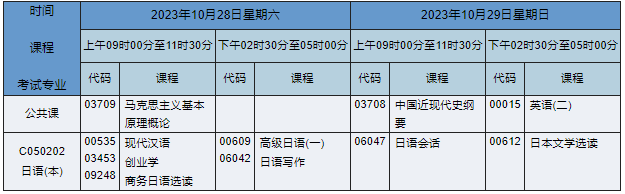 2023年10月湖南自考本科日語專業(yè)課程安排表