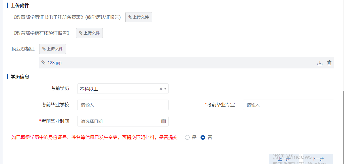 注:如已取得學歷中身份證號、姓名等信息發(fā)生變更,可選中“是”,彈出的變更前信息中,輸入相關信息,提交證明材料,點擊“下一步”按鈕,彈出如下圖所示窗口。