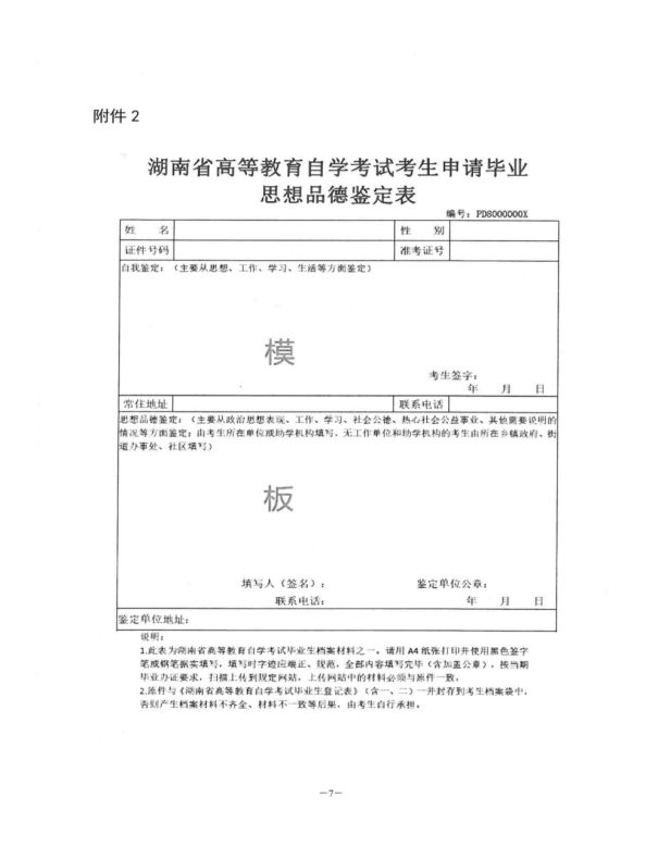 1.《湖南省高等教育自學(xué)考試考生申請畢業(yè)思想品德鑒定表》(附件1)??忌梢蕴崆霸凇昂献钥挤?wù)平臺(tái)”中的“畢業(yè)管理”欄下載(每位考生的思想品德鑒定表都有自己的防偽碼,請考生務(wù)必登錄自己的賬號(hào)下載表格),用 A4 紙張打印后按要求填寫并加蓋公章(無鑒定單位公章無效)??忌窗匆笸瓿伤枷肫返妈b定導(dǎo)致畢業(yè)審核不通過,后果由考生自行承擔(dān)。思想品德鑒定表原件將在領(lǐng)取畢業(yè)證時(shí)與《湖南省高等教育自學(xué)考試畢業(yè)生登記表》一并封存到考生檔案袋中。(請妥善保存)
