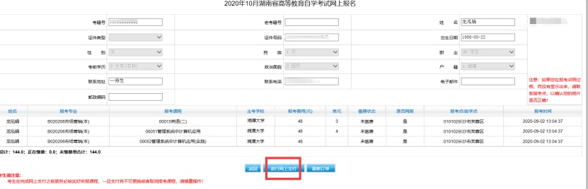 考生在進(jìn)行網(wǎng)上支付前,請(qǐng)仔細(xì)核對(duì)您要報(bào)考的課程,只有在核對(duì)無誤后才進(jìn)行網(wǎng)上支付,點(diǎn)擊界面上“進(jìn)行網(wǎng)上支付”按鈕,系統(tǒng)將自動(dòng)創(chuàng)建支付訂單。考生24小時(shí)內(nèi)未支付成功的,報(bào)考無效。