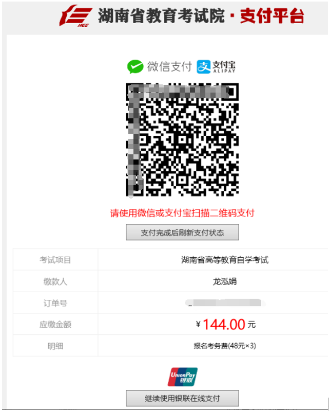 第六步:通過湖南省教育考試院支付平臺(tái)完成網(wǎng)上支付
