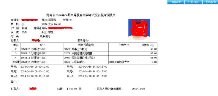 考生在報(bào)考繳費(fèi)成功后,請(qǐng)務(wù)必打印報(bào)考回執(zhí)單,在課程報(bào)考主界面點(diǎn)擊“打印回執(zhí)單”按鈕,進(jìn)入打印回執(zhí)單界面: